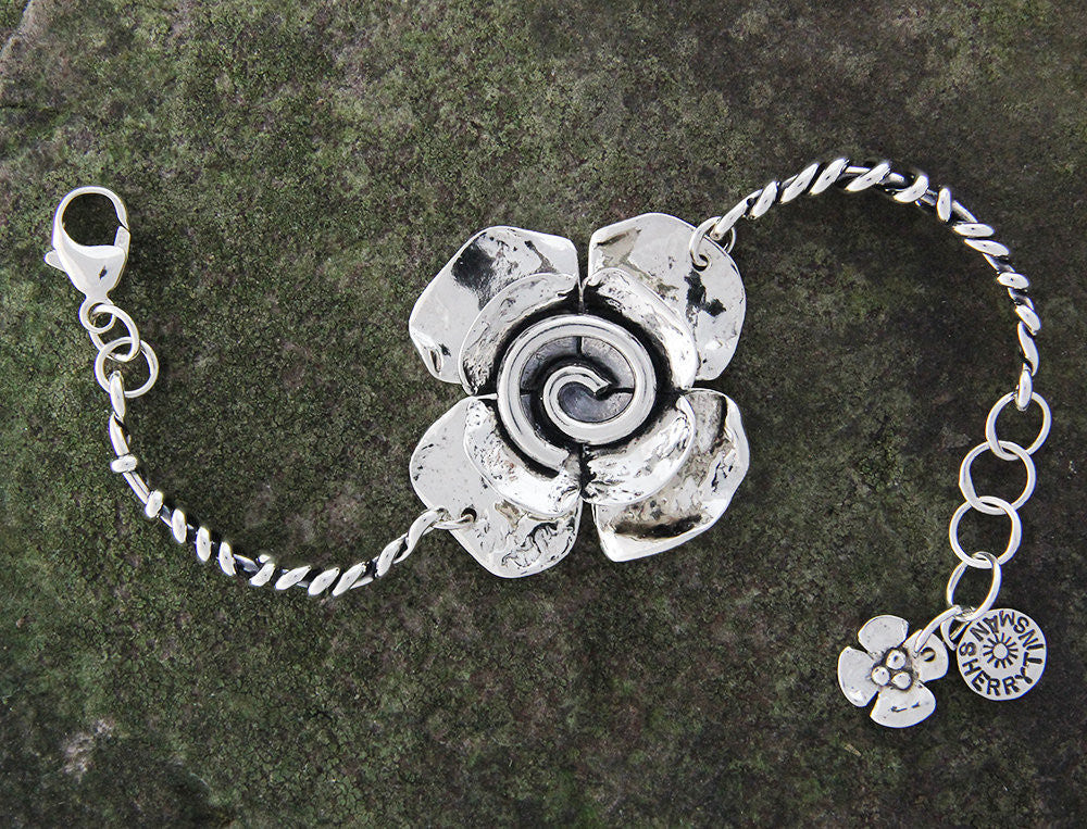This bracelet is a real statement piece. A 1.5" double dogwood flower with spiral center is the focus of this handmade bracelet, and the hand wrapped sterling silver vine sides make this bracelet measure 7.5" in total length.