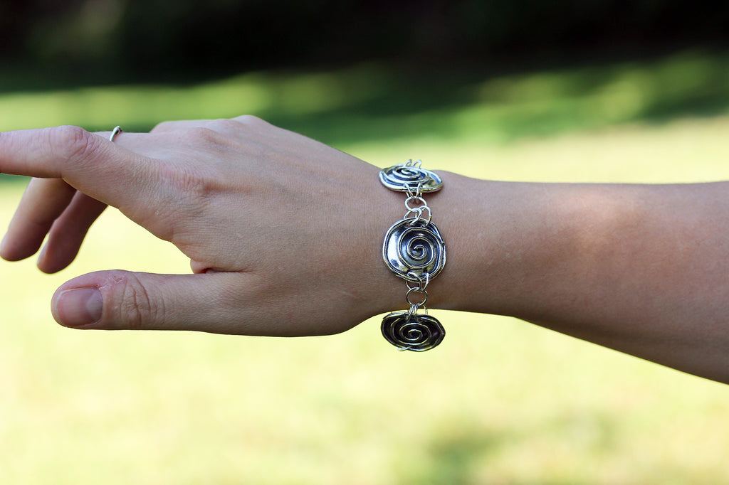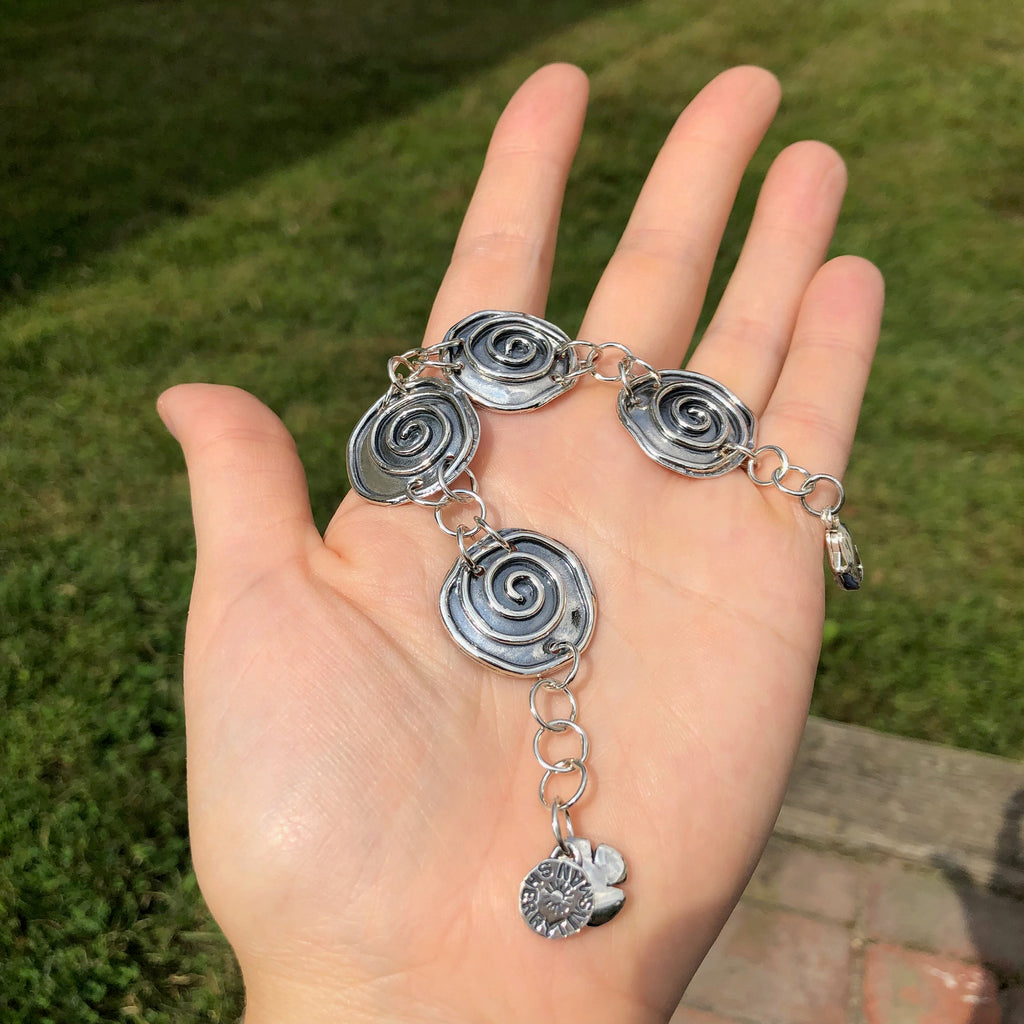This sterling silver bracelet features four swirling spiral elements. A wonderful piece for dress up or every day wear! As with all my jewelry, the finished piece was oxidized black and then the raised surface was polished to a brilliant shine. This creates a sense of depth that really shows off the natural beauty of the sterling silver.
