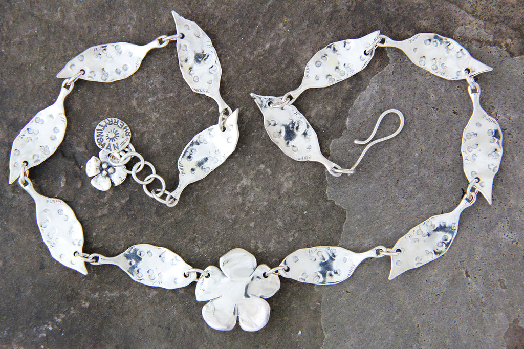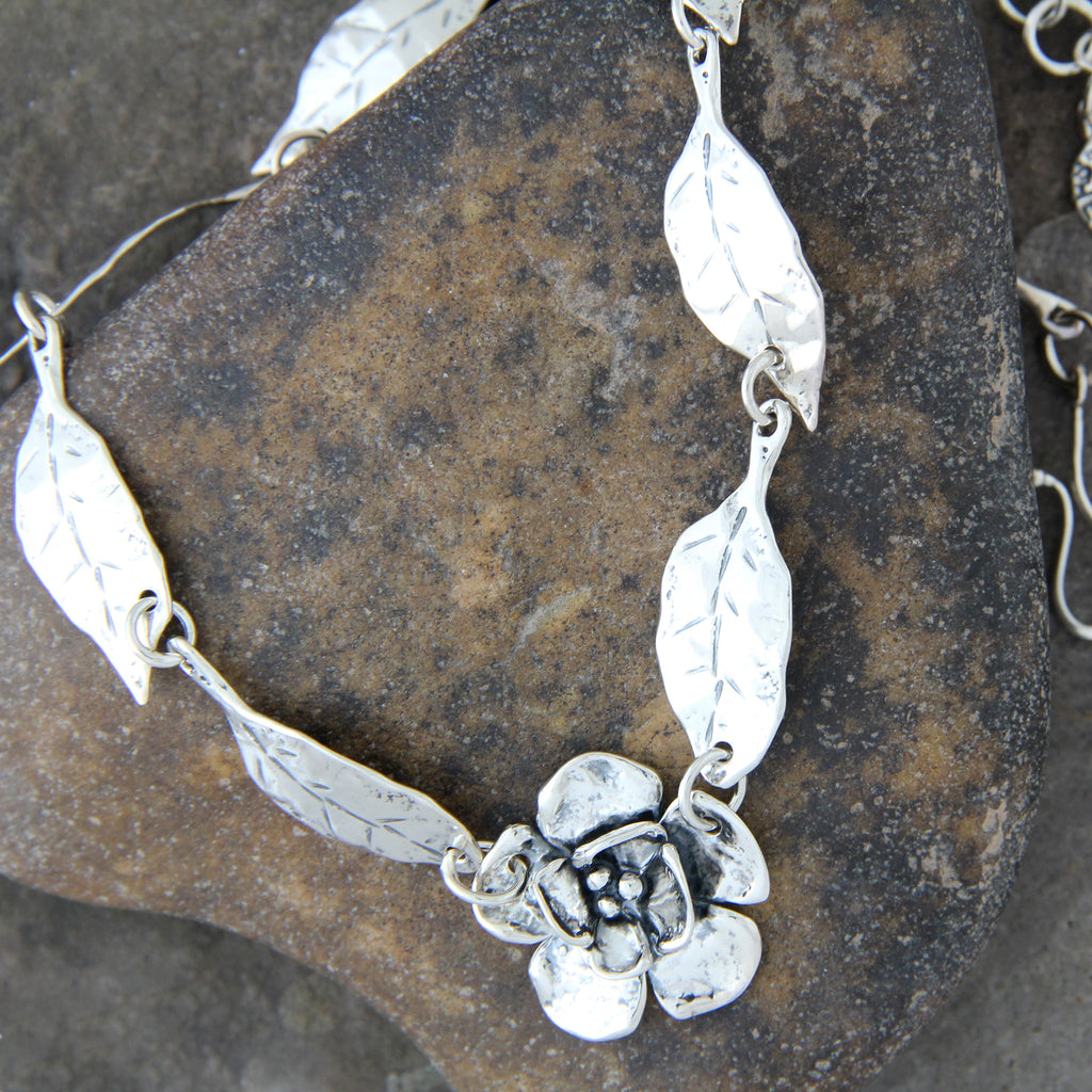 This statement necklace is comprised of strung together leaves with a 1" double dogwood flower in the center. This necklace drapes beautifully around the neck. As with all my jewelry, the finished piece was oxidized black and then the raised surface was polished to a brilliant shine. This creates a sense of depth that really shows off the natural beauty of the sterling silver.